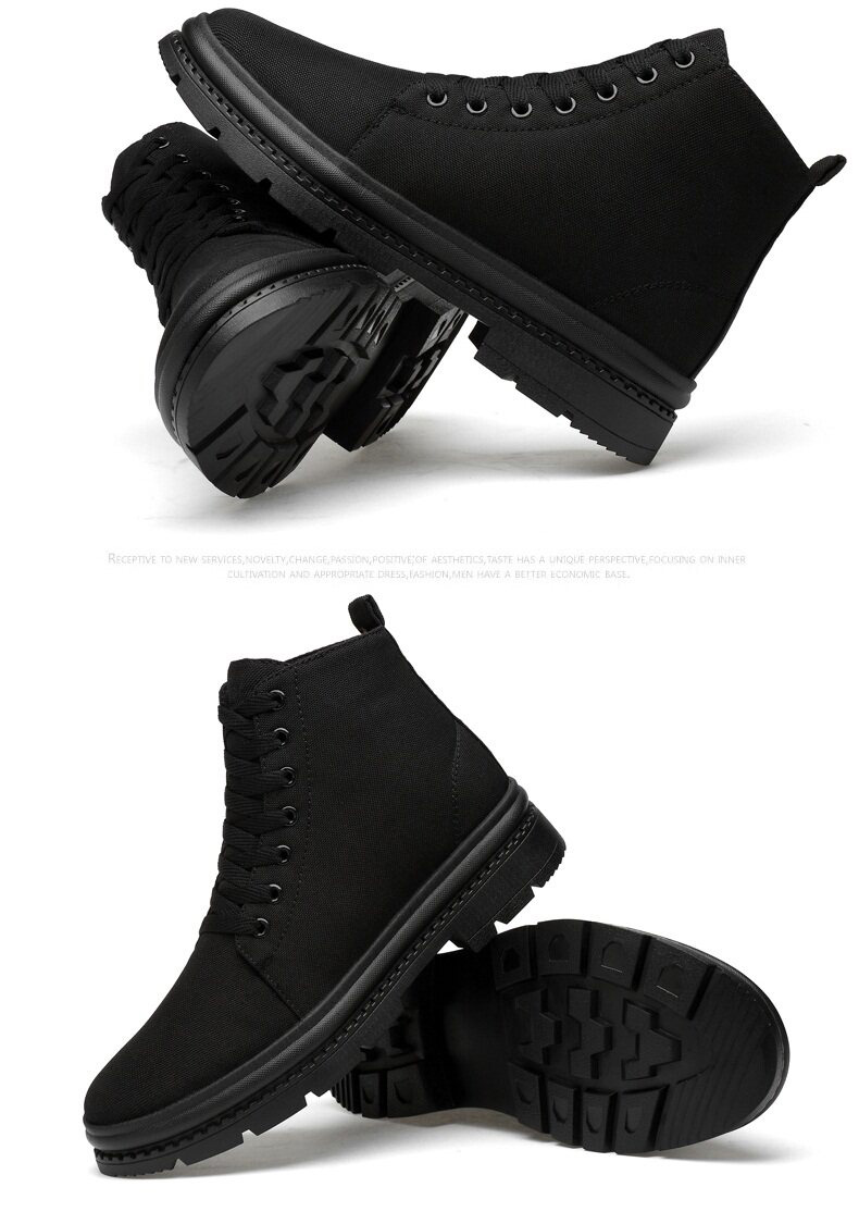 These black canvas ankle boots feature a lace-up design, a durable rubber lug sole, and are commonly sold as height-increasing elevator shoes.
