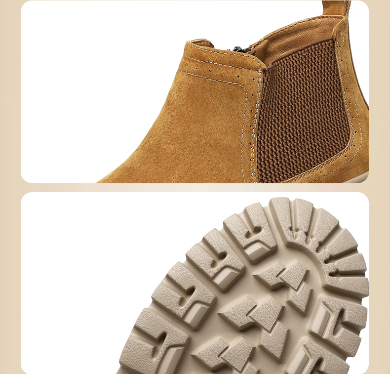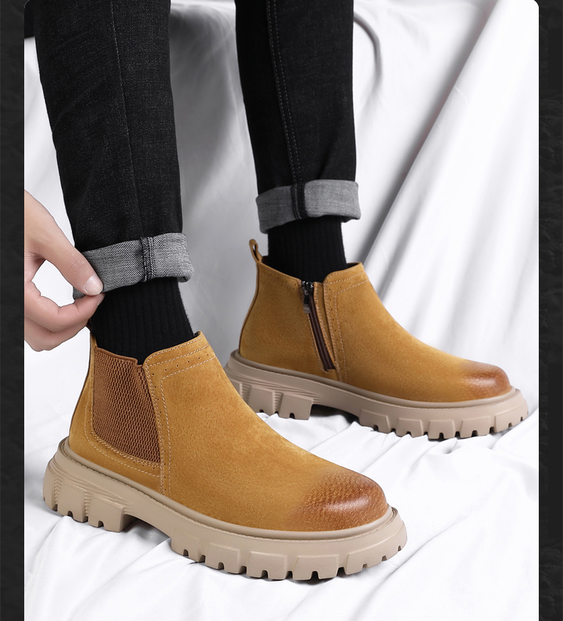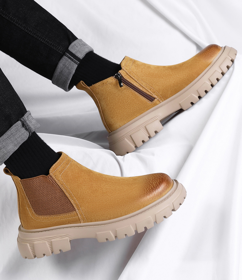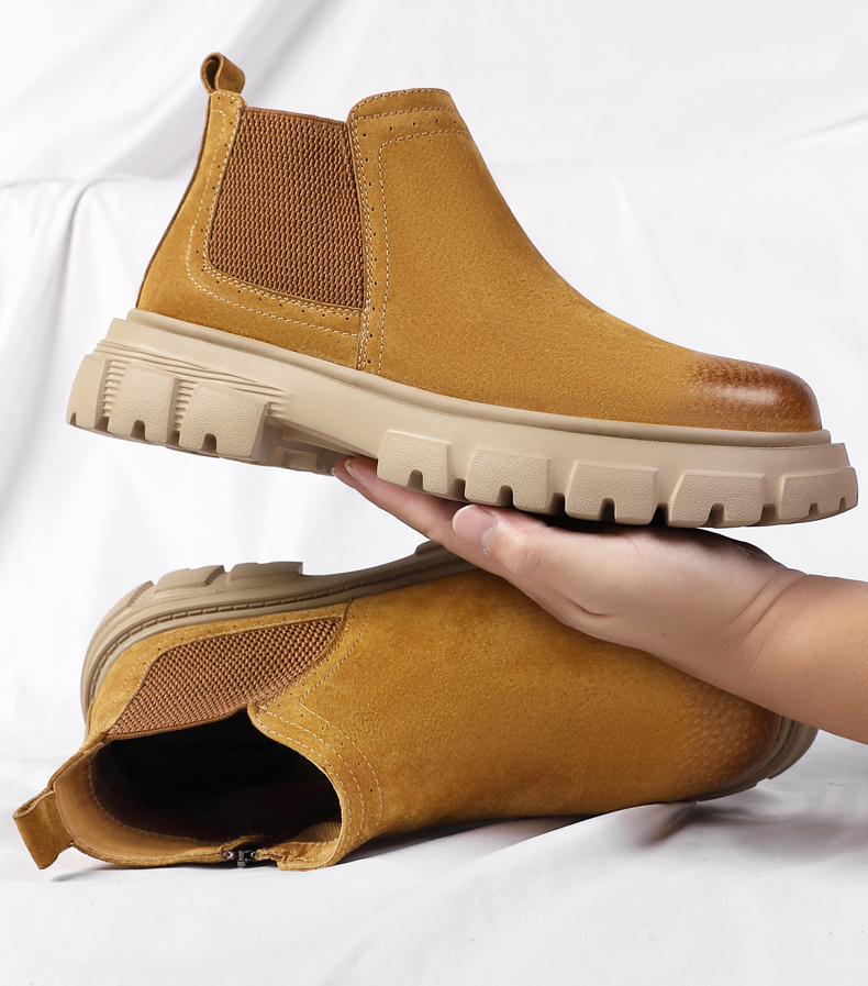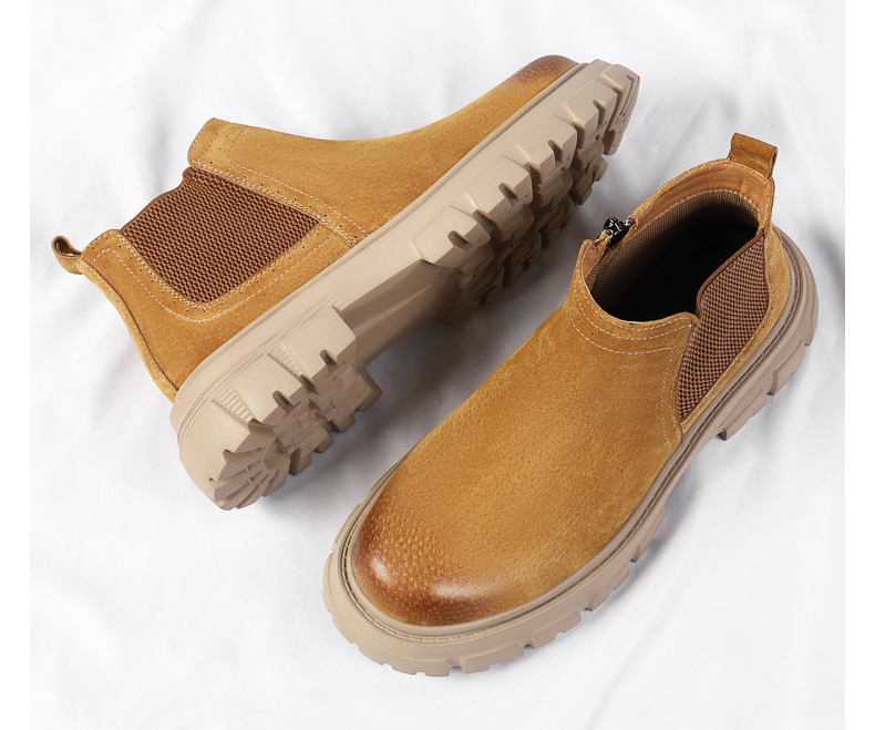 Mens tan suede elevator chelsea boots with zipper, slip on casual boots add height 2.3inch / 6cm. Features a specialized hidden lift insole that instantly adds 2.3 inches / 6 cm to your height. The full-length, cushioned design ensures the lift is discreet and comfortable.