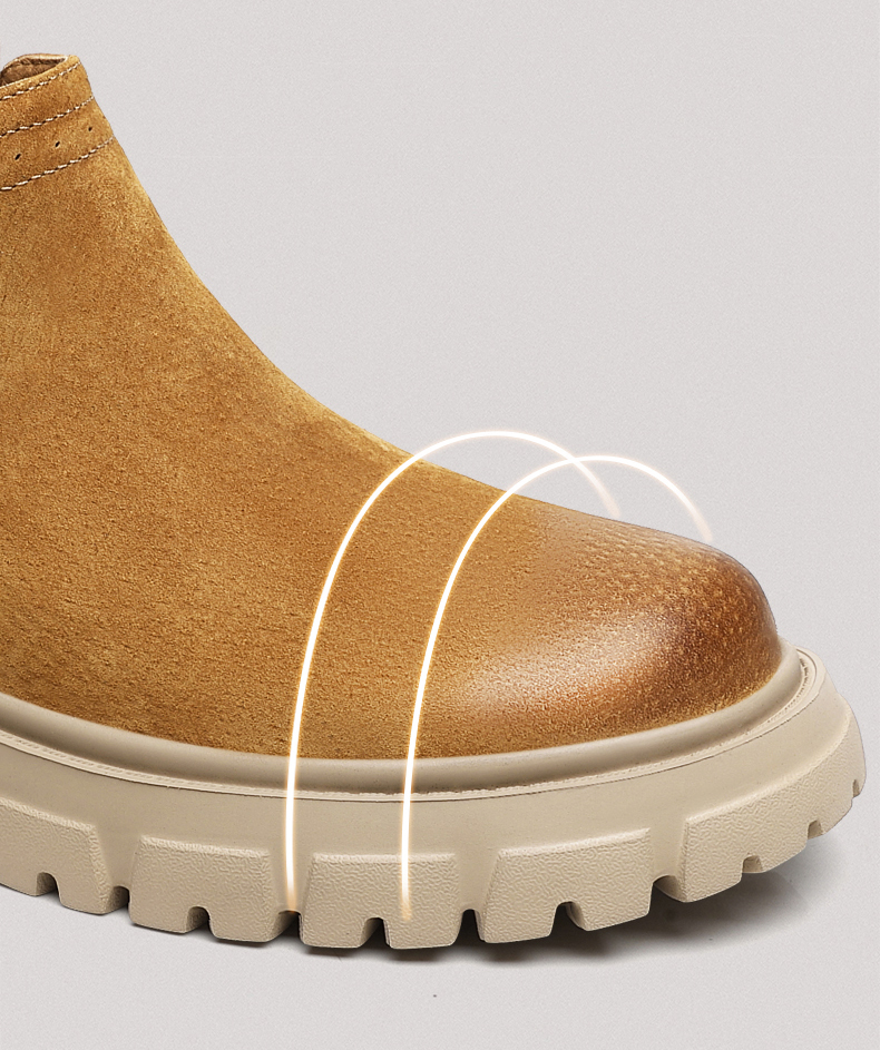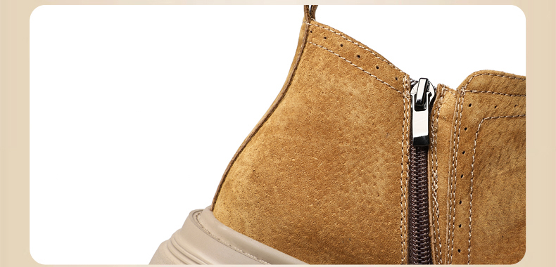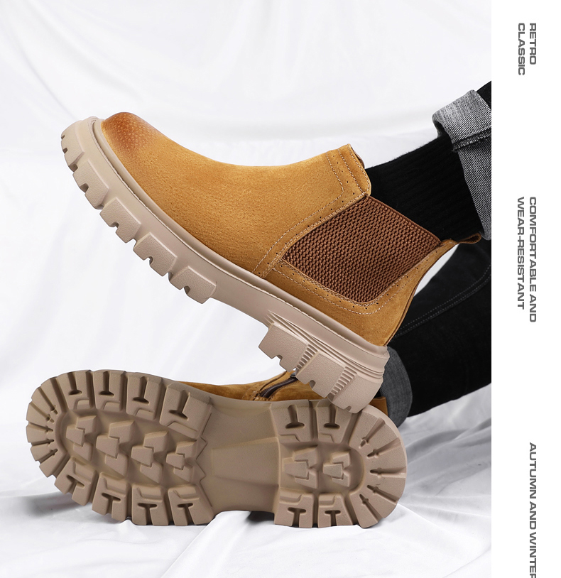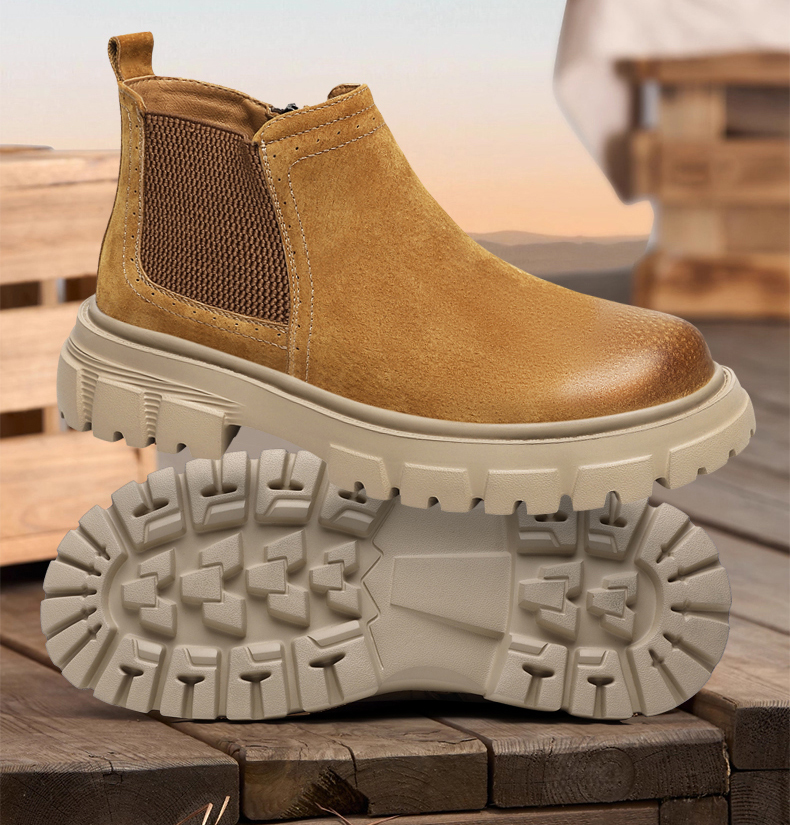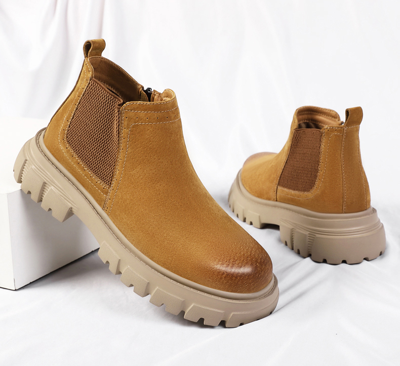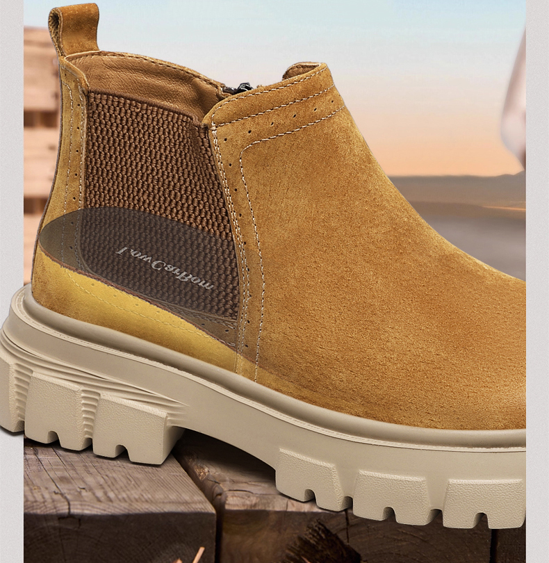 Mens tan suede elevator chelsea boots with zipper, slip on casual boots add height 2.3inch / 6cm. Features a specialized hidden lift insole that instantly adds 2.3 inches / 6 cm to your height. The full-length, cushioned design ensures the lift is discreet and comfortable.